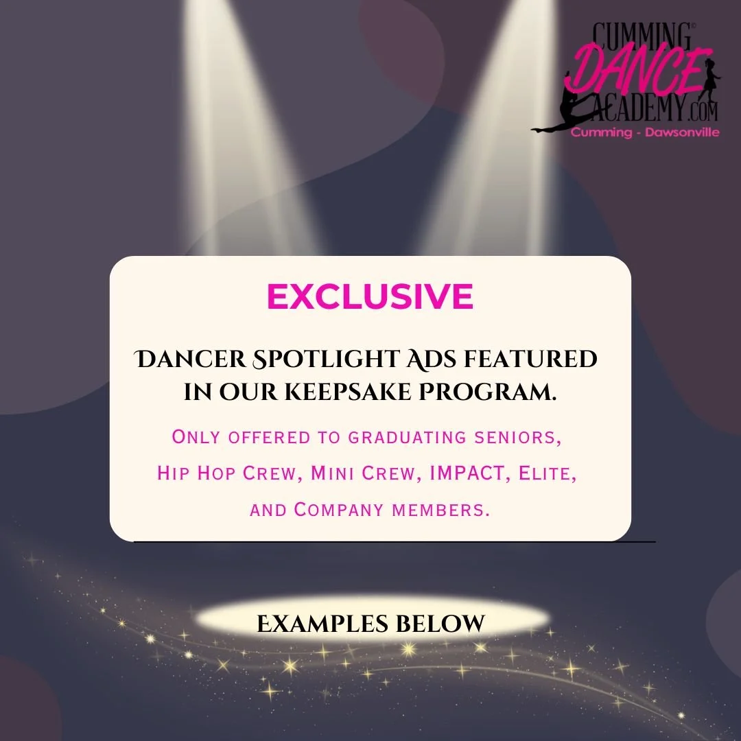 Each year we offer the exclusive option of featuring your dancer in the back of our beautiful keepsake program with our Dancer Spotlight Ads! The dancers love to see themselves in the book; and it’s a great to keep for years to come!
