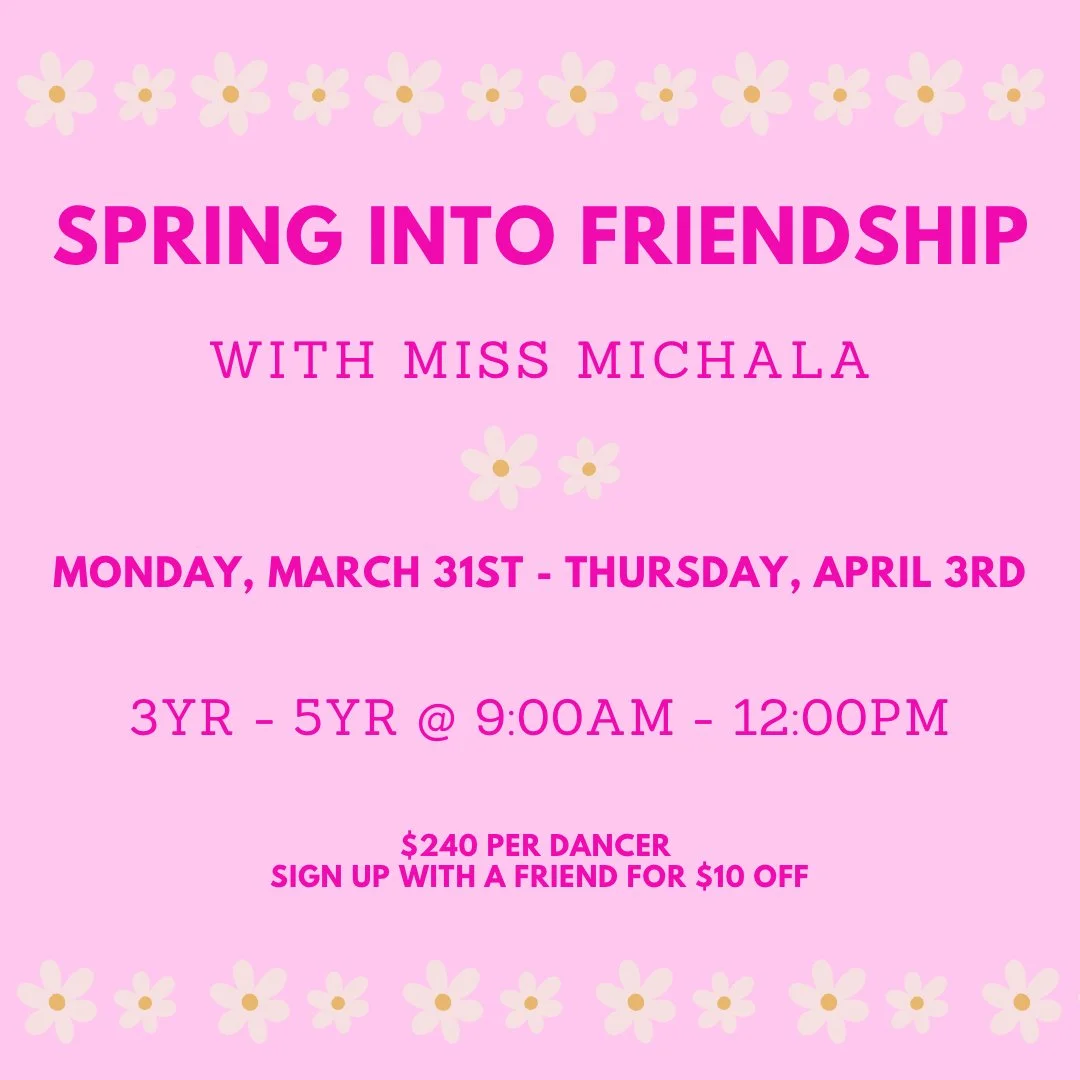 What better way to start a new season than surrounding yourself with friends? Come join us for a F U N dance camp over spring break that will leave your dancer blooming with excitement over fabulous friendships 🌼